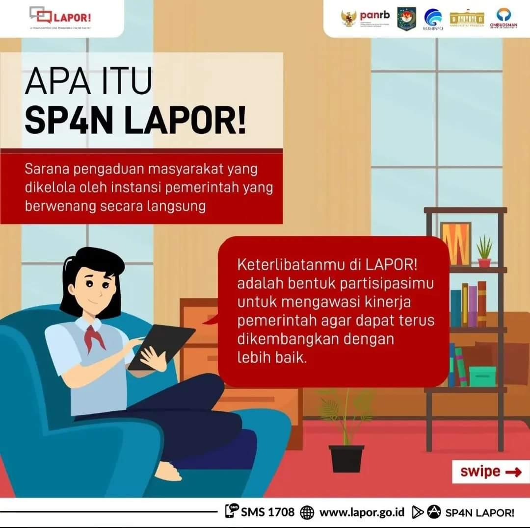 Sampaikan aspirasi dan aduan mengenai pelayanan publik ke www.lapor.go.id, SMS ke 1708, atau melalui aplikasi Android/iOS SP4N LAPOR! untuk perbaikan pelayanan publik di Indonesia. Siapanpun kamu dan apapun aspirasimu pasti akan didengar karena setiap laporan akan diperiksa dan diproses secara langsung oleh petugas LAPOR!