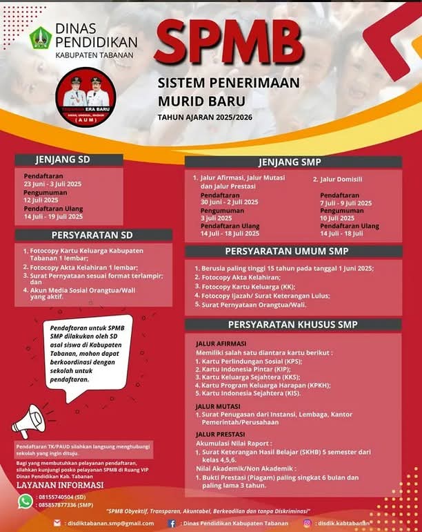 Pemerintah Kabupaten Tabanan melalui Dinas Pendidikan telah mempersiapkan secara menyeluruh Skema Penerimaan Murid Baru (SPMB) tahun ajaran 2025/2026 untuk jenjang Sekolah Dasar (SD) dan Sekolah Menengah Pertama (SMP). Dinas Pendidikan memastikan bahwa daya tampung seluruh sekolah di Kabupaten Tabanan mencukupi untuk menampung lulusan baru. Tahun ini, jumlah lulusan TK mencapai 5.784 siswa dan lulusan SD sebanyak 5.660 siswa. Dengan kapasitas sekolah yang melebihi jumlah tersebut, masyarakat tidak perlu khawatir akan kekurangan ruang belajar bagi putra-putrinya.