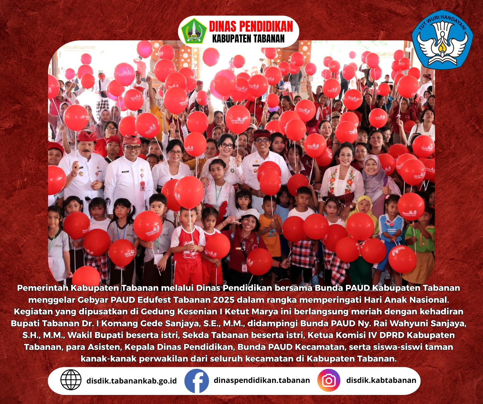 Tabanan, 23 Juli 2025 – Pemerintah Kabupaten Tabanan melalui Dinas Pendidikan bersama Bunda PAUD Kabupaten Tabanan menggelar Gebyar PAUD Edufest Tabanan 2025 dalam rangka memperingati Hari Anak Nasional. Kegiatan yang dipusatkan di Gedung Kesenian I Ketut Marya ini berlangsung meriah dengan kehadiran Bupati Tabanan Dr. I Komang Gede Sanjaya, S.E., M.M., didampingi Bunda PAUD Ny. Rai Wahyuni Sanjaya, S.H., M.M., Wakil Bupati beserta istri, Sekda Tabanan beserta istri, Ketua Komisi IV DPRD Kabupaten Tabanan, para Asisten, Kepala Dinas Pendidikan, Bunda PAUD Kecamatan, serta siswa-siswi taman kanak-kanak perwakilan dari seluruh kecamatan di Kabupaten Tabanan.