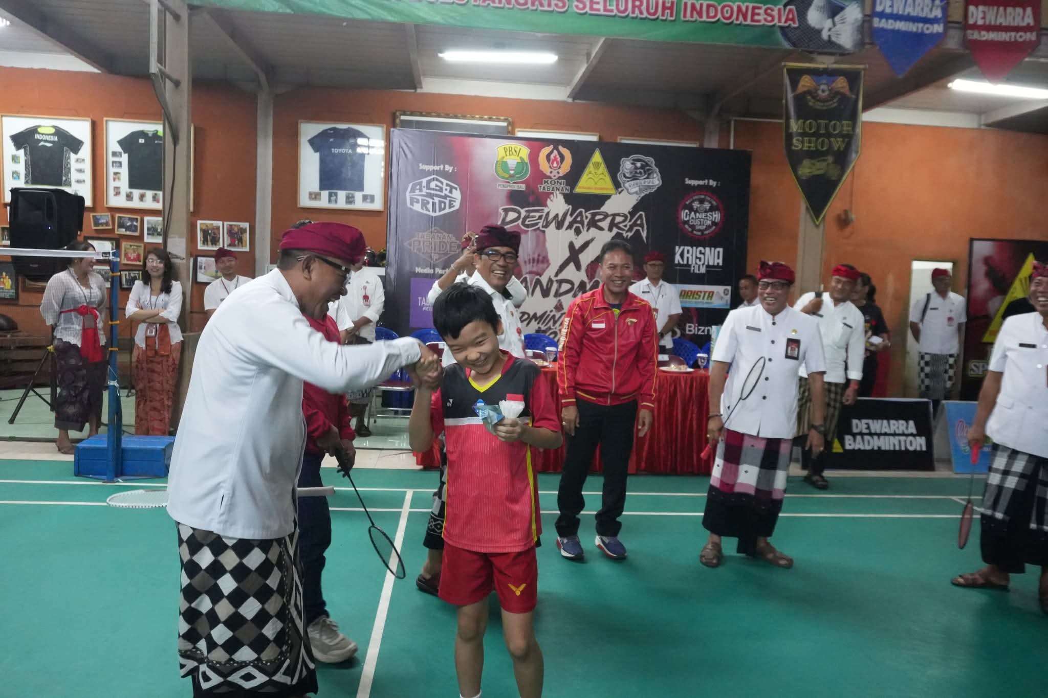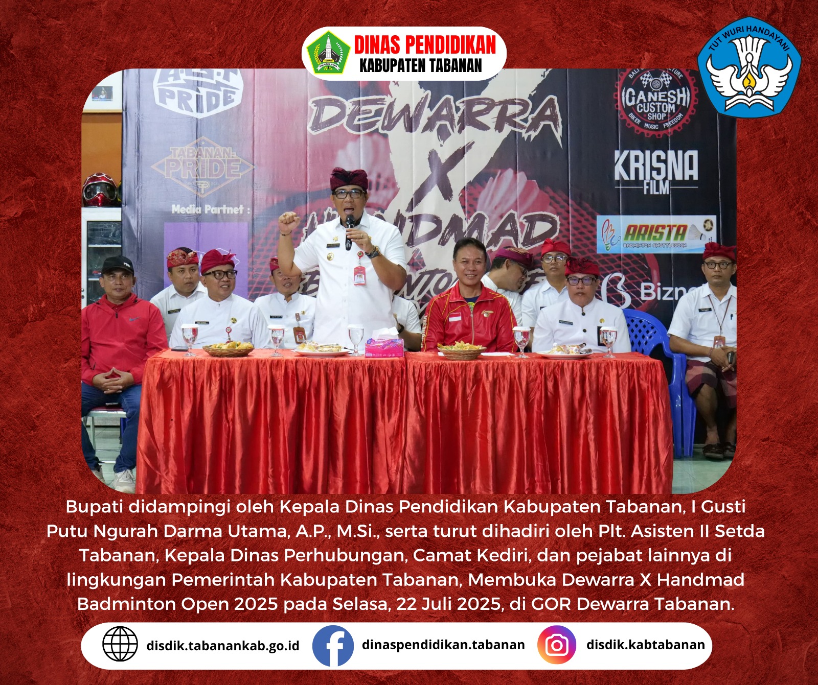 Pemerintah Kabupaten Tabanan menunjukkan komitmennya dalam mendukung pembinaan olahraga melalui pembukaan Dewarra X Handmad Badminton Open 2025 yang secara resmi dibuka oleh Bupati Tabanan, Dr. I Komang Gede Sanjaya, S.E., M.M., pada Selasa, 22 Juli 2025, di GOR Dewarra Tabanan. Dalam pembukaan tersebut, Bupati didampingi oleh Kepala Dinas Pendidikan Kabupaten Tabanan, I Gusti Putu Ngurah Darma Utama, A.P., M.Si., serta turut dihadiri oleh Plt. Asisten II Setda Tabanan, Kepala Dinas Perhubungan, Camat Kediri, dan pejabat lainnya di lingkungan Pemerintah Kabupaten Tabanan.