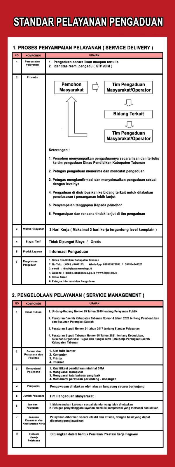 Berikut disampaikan Standar Pelayanan Pengaduan pada Dinas Pendidikan Kabupaten Tabanan